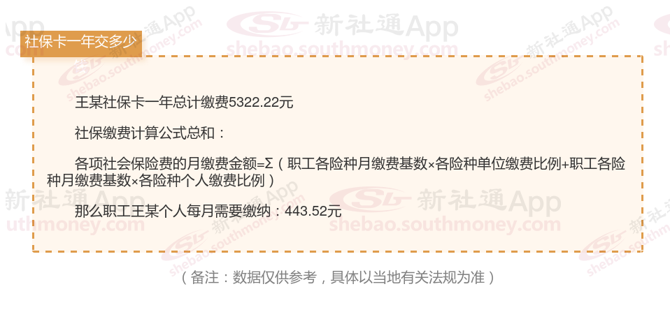 由上图得知,王某社保卡一年需要缴纳5322.22元,职工个人月缴纳443.52元,若您想要了解明细点击新社通社保计算器,来了解一下明细吧。