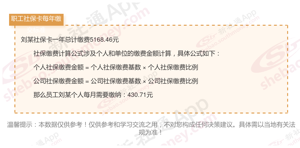 由上图得知,刘某社保卡一年需要缴纳5168.46元,职工个人月缴纳430.71元,若您想要了解明细点击新社通社保计算器,来了解一下明细吧。