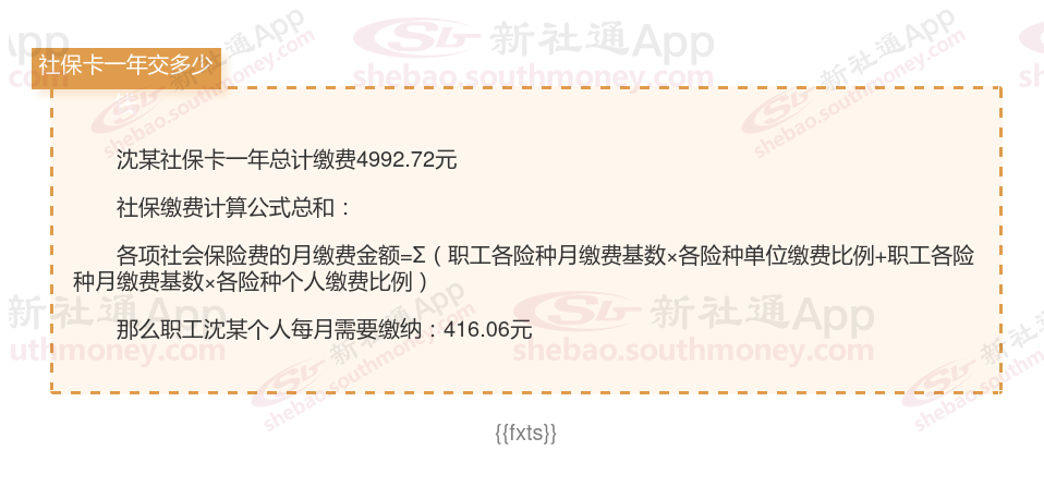 由上图得知,沈某社保卡一年需要缴纳4992.72元,个人部分每月需要缴纳416.06元,若您想要了解明细点击新社通社保计算器,来了解一下明细吧。