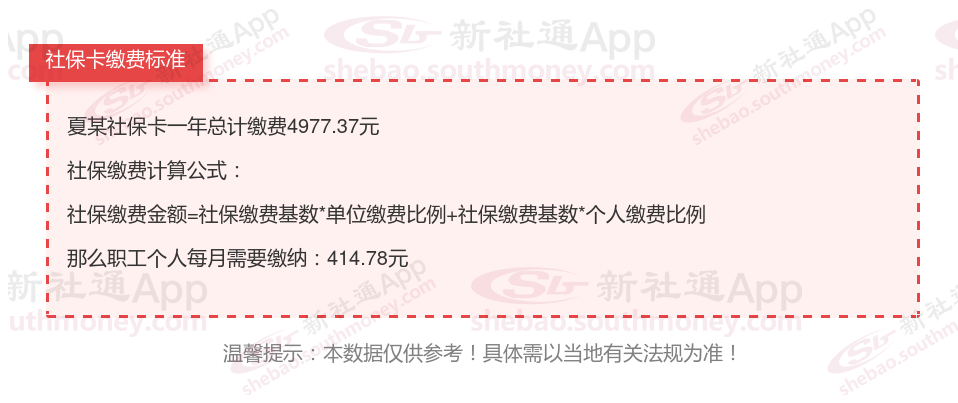由上图得知,夏某社保卡一年需要缴纳4977.37元,个人部分每月需要缴纳414.78元,若您想要了解明细点击新社通社保计算器,来了解一下明细吧。