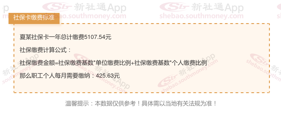 由上图得知,夏某社保卡一年需要缴纳5107.54元,个人部分每月需要缴纳425.63元,若您想要了解明细点击新社通社保计算器,来了解一下明细吧。
