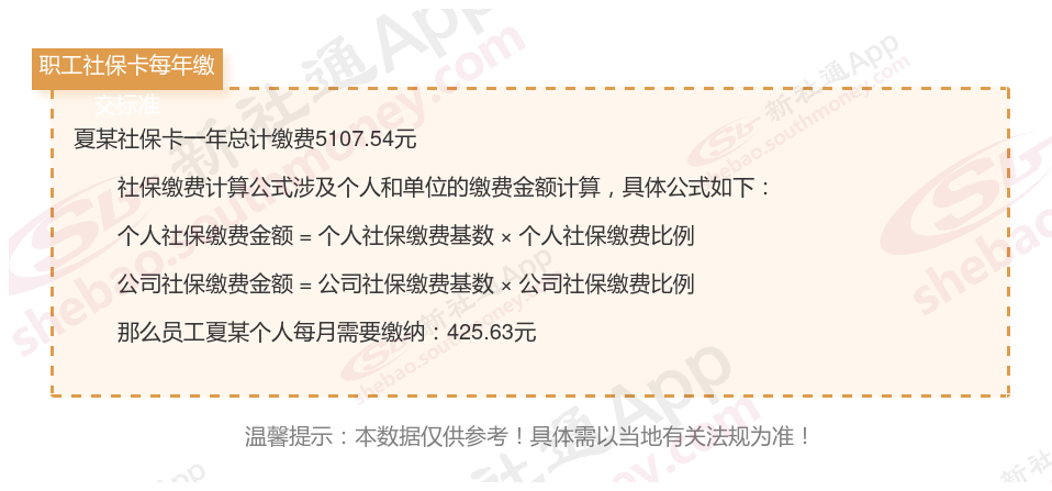 由上图得知,夏某社保卡一年需要缴纳5107.54元,个人部分每月需要缴纳425.63元,若您想要了解明细点击新社通社保计算器,来了解一下明细吧。