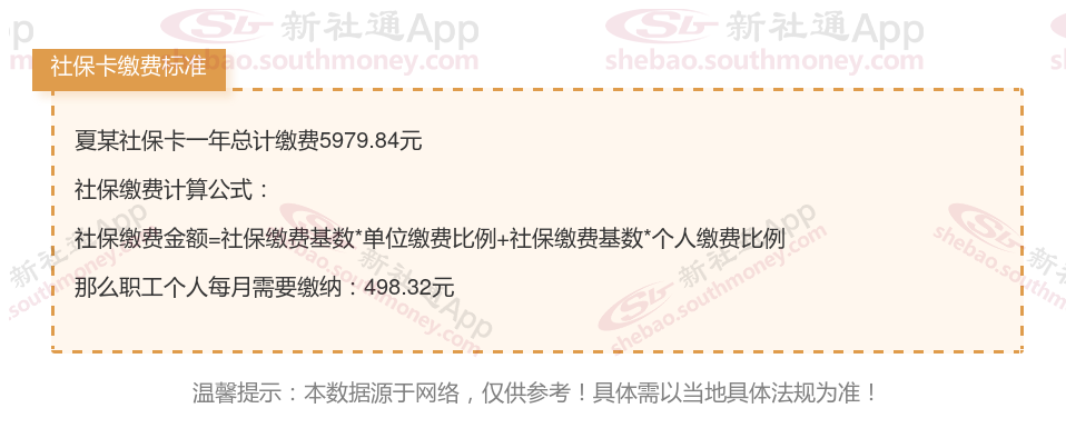 由上图得知,夏某社保卡一年需要缴纳5979.84元,职工个人月缴纳498.32元,若您想要了解明细点击新社通社保计算器,来了解一下明细吧。