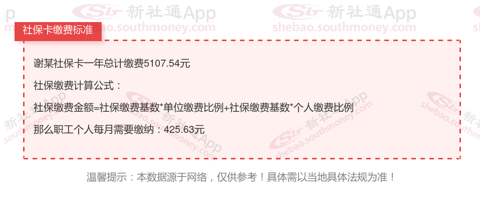 由上图得知,谢某社保卡一年需要缴纳5107.54元,个人部分每月需要缴纳425.63元,若您想要了解明细点击新社通社保计算器,来了解一下明细吧。