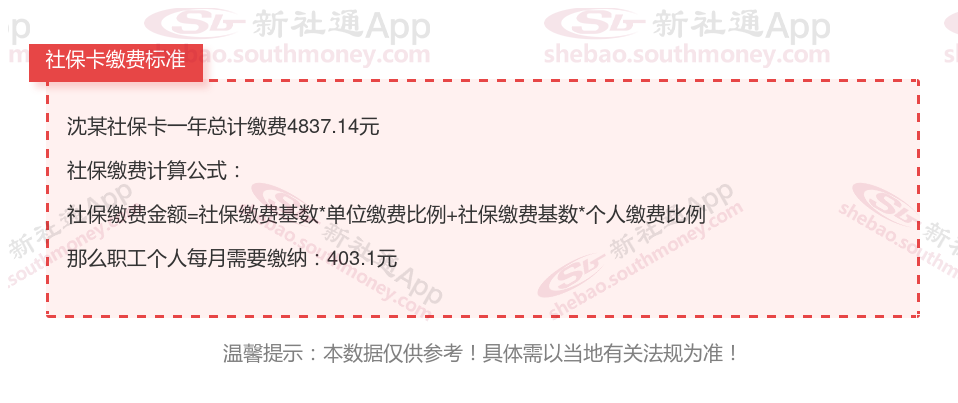 由上图得知,沈某社保卡一年需要缴纳4837.14元,职工个人月缴纳403.1元,若您想要了解明细点击新社通社保计算器,来了解一下明细吧。
