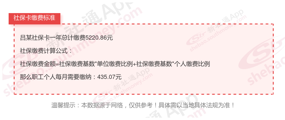 由上图得知,吕某社保卡一年需要缴纳5220.86元,个人部分每月需要缴纳435.07元,若您想要了解明细点击新社通社保计算器,来了解一下明细吧。