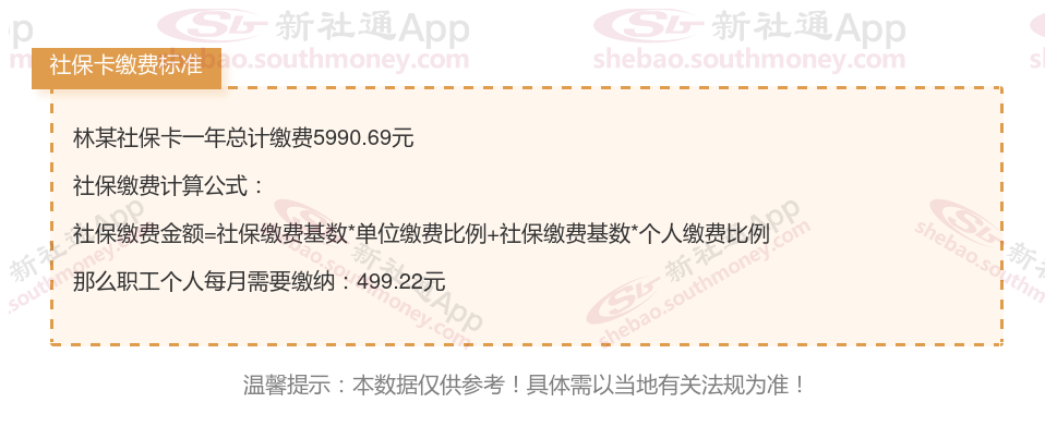 由上图得知,林某社保卡一年需要缴纳5990.69元,个人部分每月需要缴纳499.22元,若您想要了解明细点击新社通社保计算器,来了解一下明细吧。
