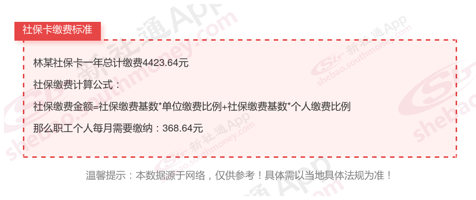由上图得知,林某社保卡一年需要缴纳4423.64元,个人部分每月需要缴纳368.64元,若您想要了解明细点击新社通社保计算器,来了解一下明细吧。