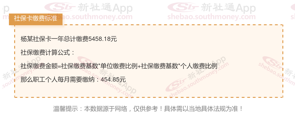 由上图得知,杨某社保卡一年需要缴纳5458.18元,职工个人月缴纳454.85元,若您想要了解明细点击新社通社保计算器,来了解一下明细吧。
