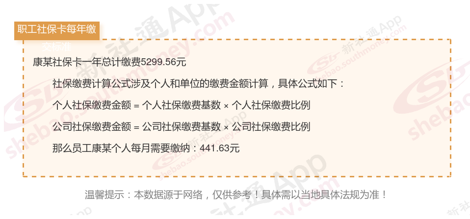 由上图得知,康某社保卡一年需要缴纳5299.56元,个人部分每月需要缴纳441.63元,若您想要了解明细点击新社通社保计算器,来了解一下明细吧。