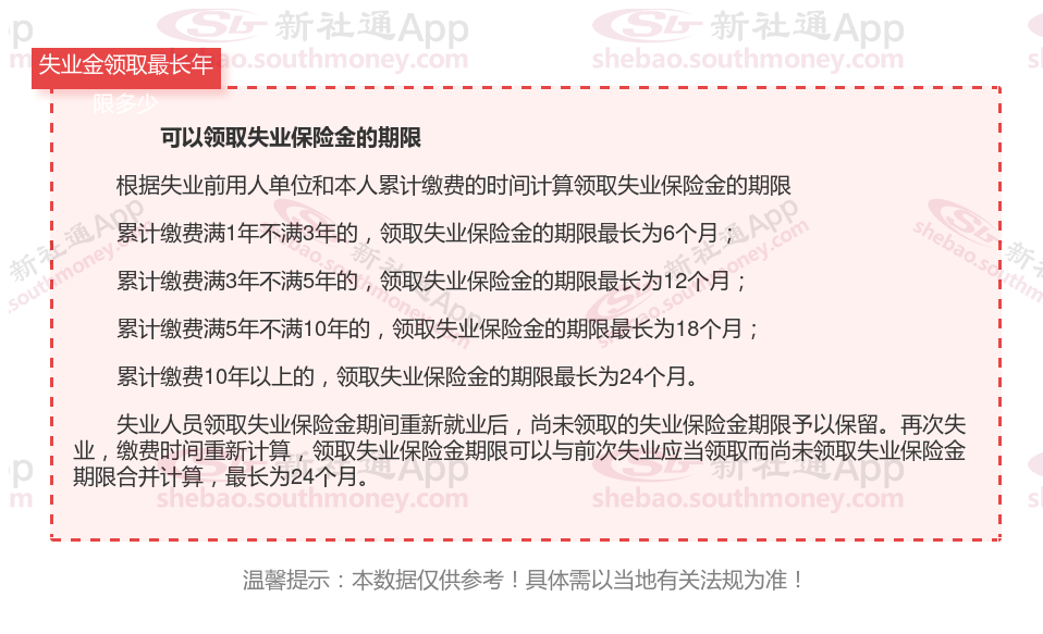 累计缴费十年以上:领取失业保险金的期限最长为二十四个月。也就是说,缴费满十年后,每多缴一年,可多领三个月的失业金,但最长不超过24个月。