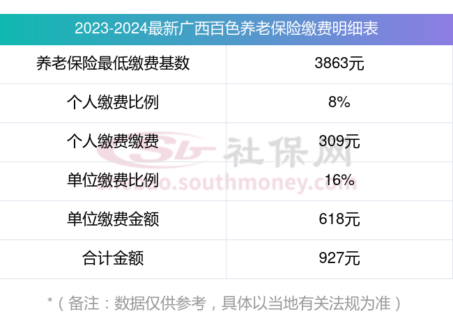 假设广西百色的养老保险缴费基数为3863元,个人按照8%的比例缴纳养老保险费用,企业按照16%的比例缴纳。则该职工的养老保险缴费计算如下: