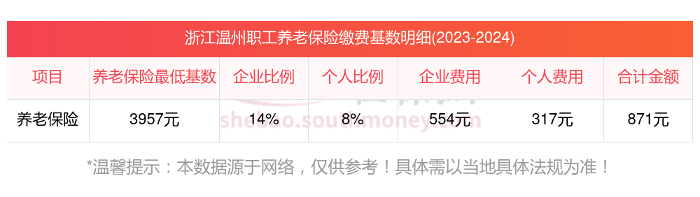 假设浙江温州的养老保险缴费基数为3957元,个人按照8%的比例缴纳养老保险费用,企业按照14%的比例缴纳。则该职工的养老保险缴费计算如下: