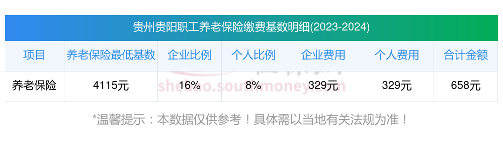 贵州贵阳养老保险缴费基数2023-2024年最新标准(最低)