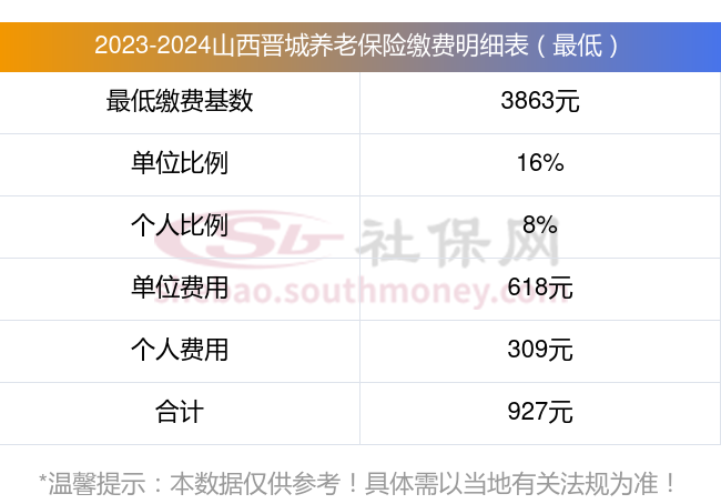 山西晋城养老保险缴费基数2023-2024年最新标准(最低)