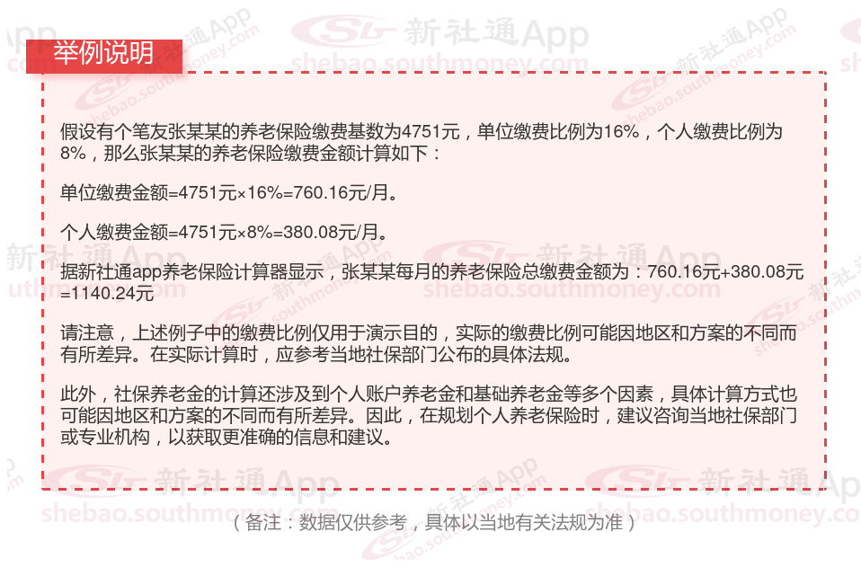 缴费基数下限暂按不低于4751元/月执行。按照单位16%+个人8%的缴费费率,单位和个人养老保险缴费金额分别不低于760.16元/月、不低于380.08元/月。