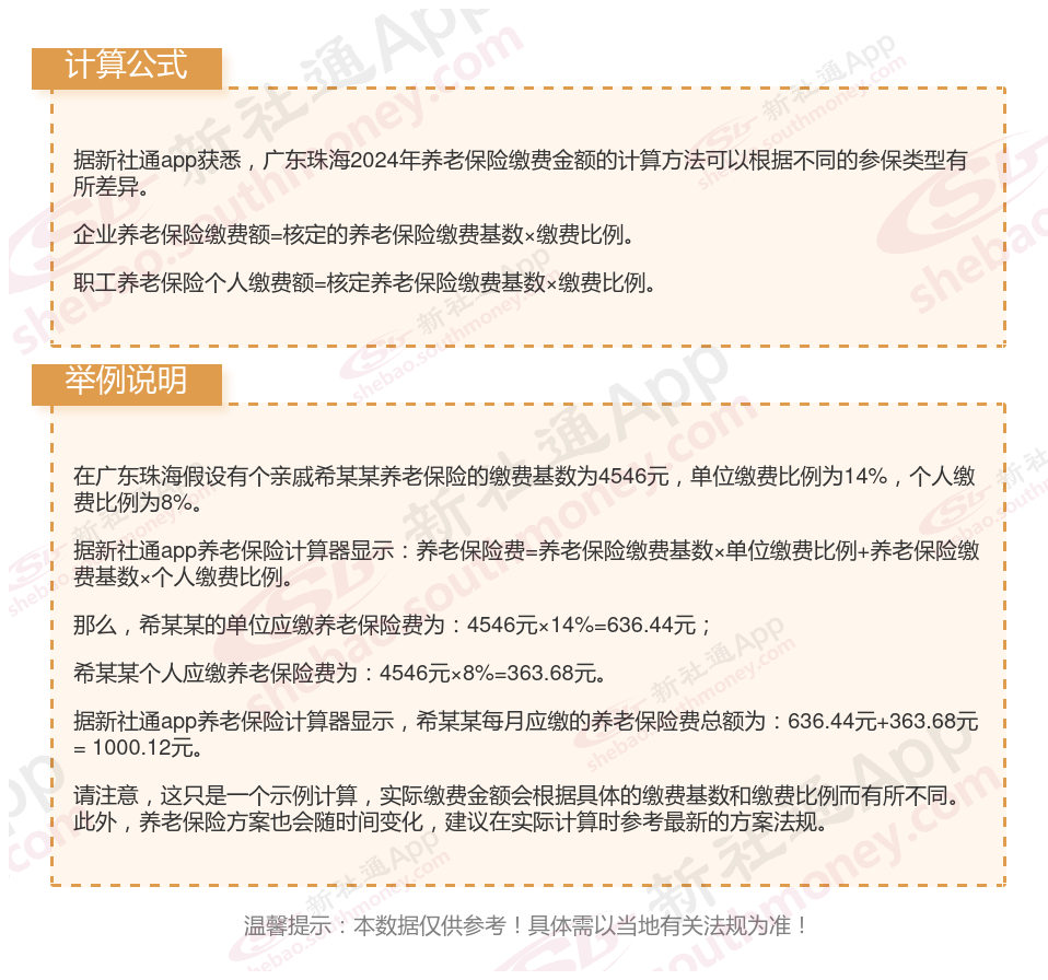 据新社通app获悉,广东珠海养老保险的缴费金额计算通常涉及缴费基数和缴费比例两个因素。以下是一个基于虚构数据的计算举例说明: