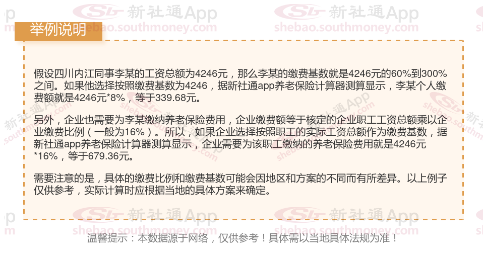 据新社通app显示,四川内江职工养老保险最低缴费基数为:4246元;单位和个人的缴费比例分别为:16%、8%;