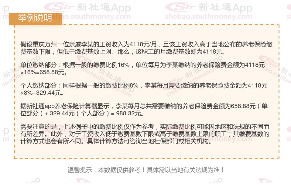 据新社通app显示,重庆万州养老保险缴费基数2023-2024年最新标准如下: