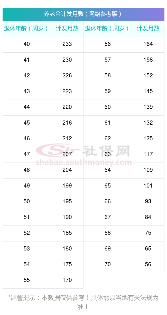 据了解,养老金计发月数是指养老金待遇计划发放的月数。目前,我国对于不同年龄段的退休职工,养老金计发月数有固定的法规。具体来说,60岁退休的职工,其个人账户养老金的计发月数为139个月;55岁退休的职工,计发月数为170个月;而50岁退休的职工,计发月数则为195个月。