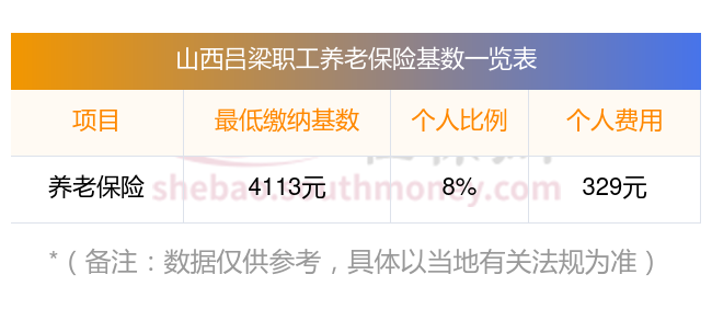 据新社通app获悉,山西吕梁的养老保险缴费金额因个人情况而异,包括个人缴费基数、缴费比例等因素。以下是一些参考信息: