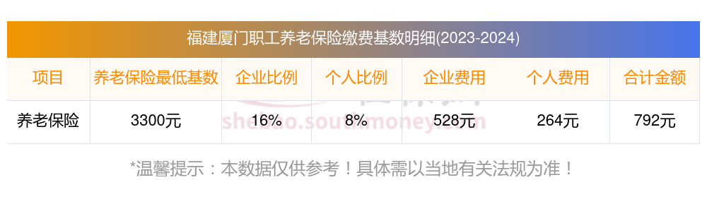 福建厦门养老保险缴费基数2023-2024年最新标准(最低)要交多少钱一个月?
