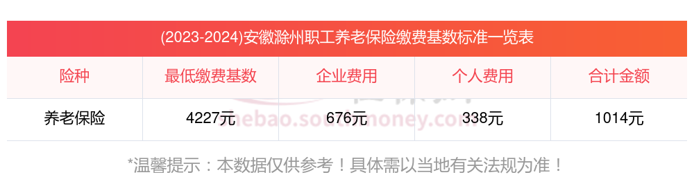 安徽滁州养老保险缴费基数2023年最新标准(最低)
