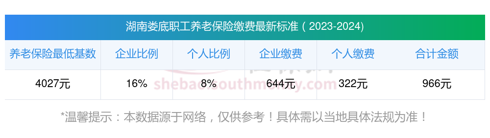 2023-2024年湖南娄底养老保险缴费比例及基数标准(最新)