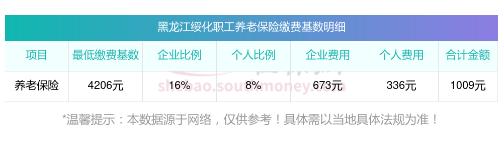 假设黑龙江绥化某职工的养老保险缴费基数为4206元,黑龙江绥化法规的养老保险缴费比例为:企业缴纳比例为16%,个人缴纳比例为8%。