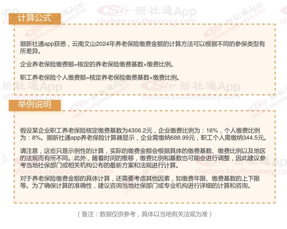 据新社通app获悉,云南文山养老保险缴费金额的计算涉及多个因素,包括缴费基数、缴费比例等,且各地的具体方案可能存在差异。以下是一个基于一般情况的养老保险缴费金额计算举例: