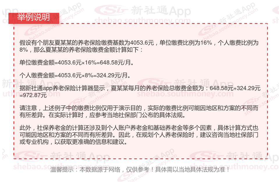 养老缴费基数为:4053.6,个人缴费:324.29元,企业缴费:648.58元,合计缴费:972.87元。