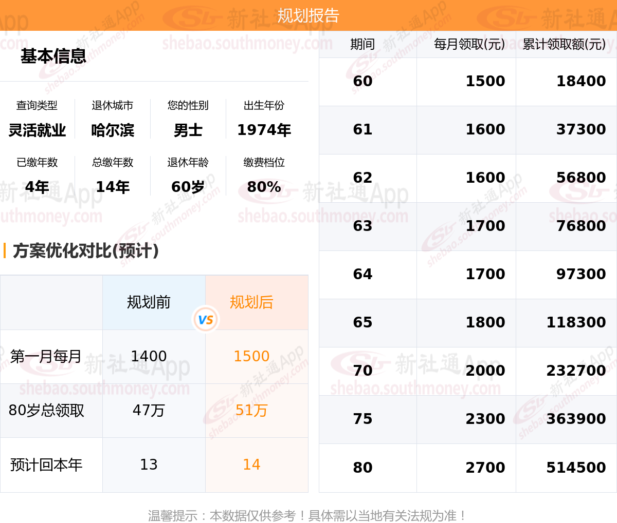 规划前:60岁退休后约领1400元,规划后:60岁退休后约领1500元