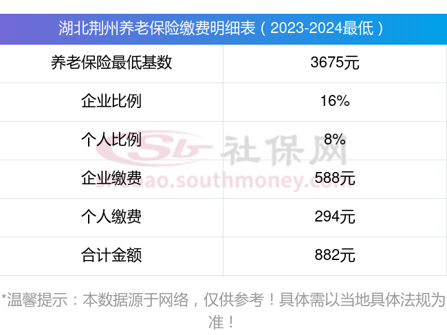 据新社通app显示,湖北荆州职工养老保险最低缴费基数为:3675元;单位和个人的缴费比例分别为:16%、8%;