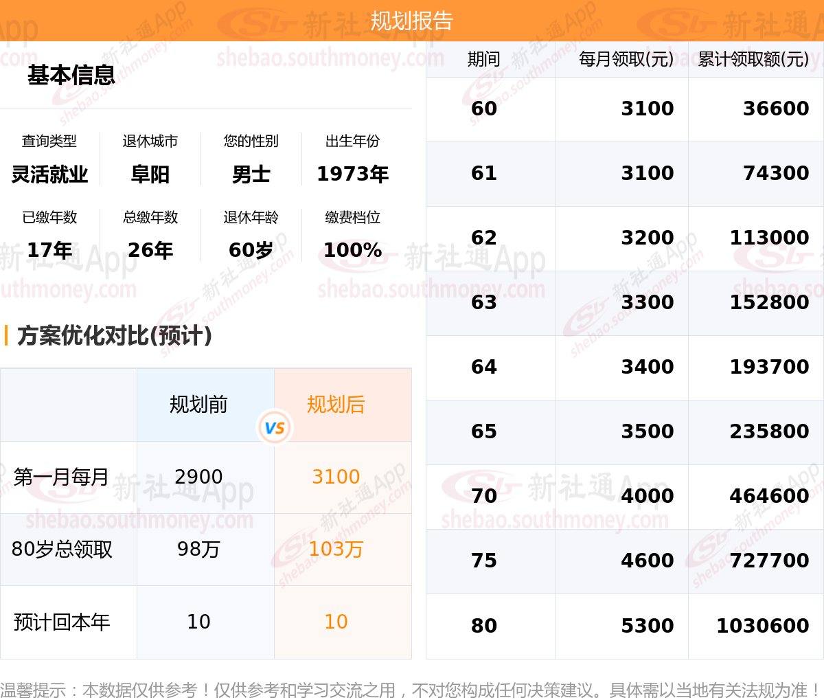 规划前:60岁第一个月约领2900元,新社通APP-养老金规划后:60岁第一个月约领3100元