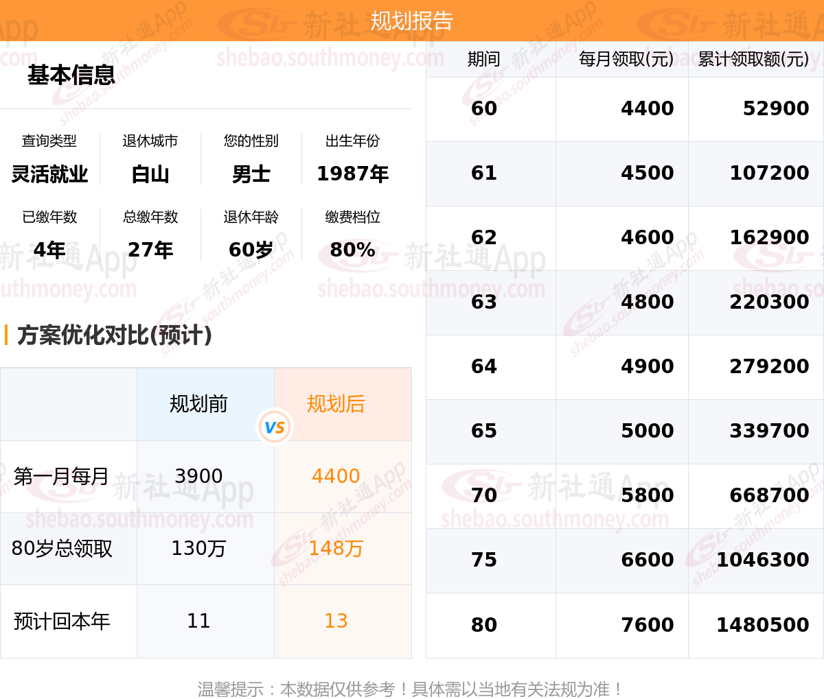 规划前:参保城市:吉林白山,性别:男士,出生年月:1987,已缴年限:4年,总缴年数:27年,退休年龄:60岁,缴费档位:80%。