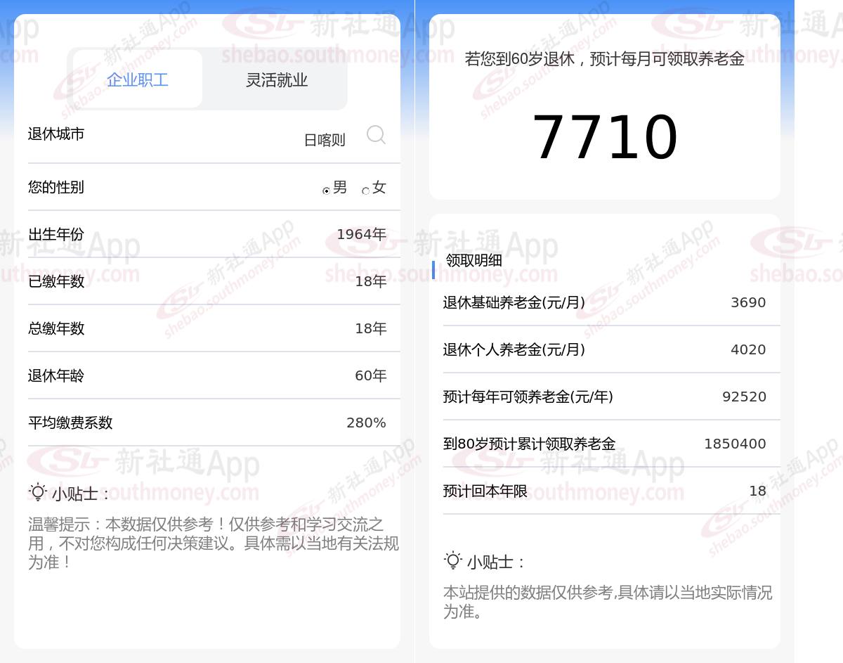 退休城市:西藏日喀则,性别:男,出生年份:1964,总缴年数18年,缴费档次:280%,新社通app养老金计算器所得: