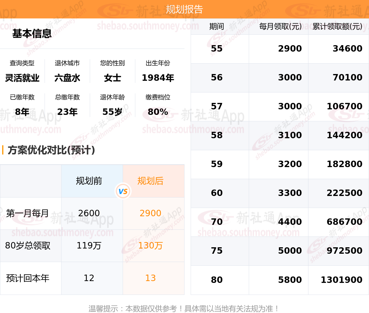规划前:55岁第一个月约领2600元,新社通APP-养老金规划后:55岁第一个月约领2900元