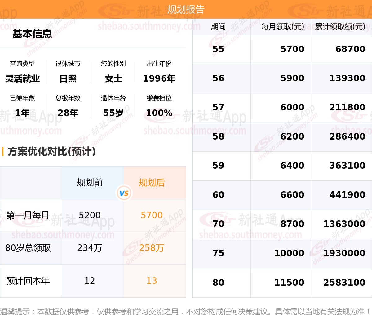 规划前:55岁退休后约领5200元,规划后:55岁退休后约领5700元