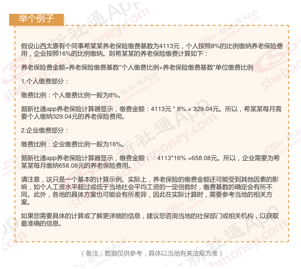 据新社通app获悉,山西太原养老保险缴费金额的计算主要依据缴费基数和缴费比例。以下是一个具体的计算举例: