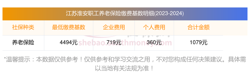据新社通app获悉,江苏淮安的养老保险缴费金额因个人情况而异,包括个人缴费基数、缴费比例等因素。以下是一些参考信息: