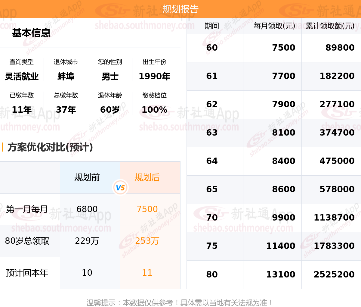 规划前:60岁第一个月约领6800元,新社通APP-养老金规划后:60岁第一个月约领7500元