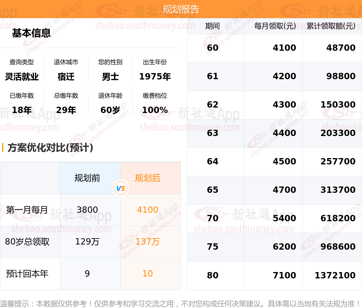 规划前:60岁第一个月约领3800元,新社通APP-养老金规划后:60岁第一个月约领4100元