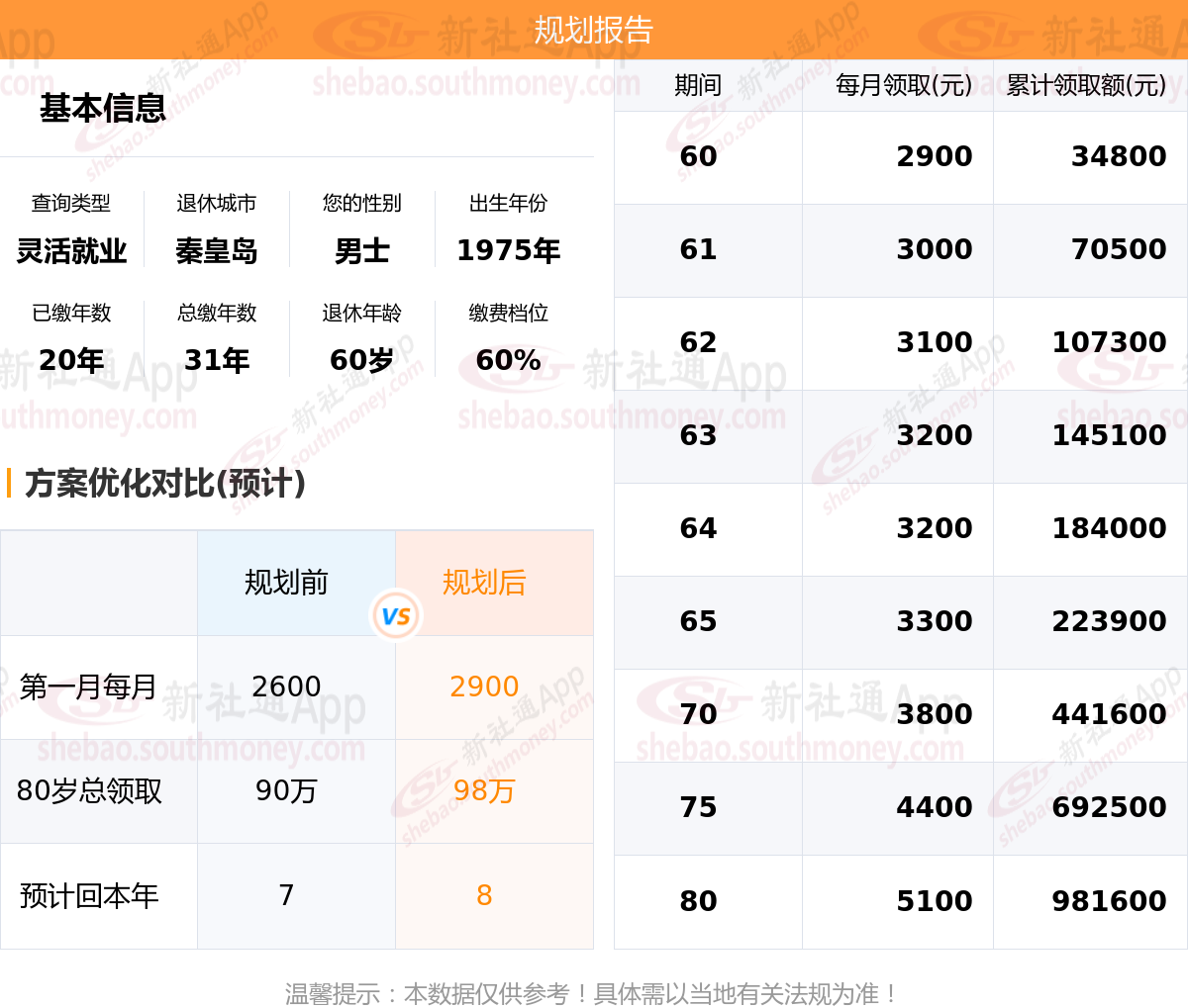 规划前:参保城市:河北秦皇岛,性别:男士,出生年月:1975,已缴年限:20年,总缴年数:31年,退休年龄:60岁,缴费档位:60%。