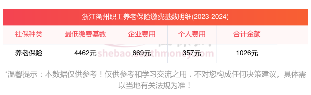 浙江衢州养老保险缴费基数2023-2024年最新标准(最低)