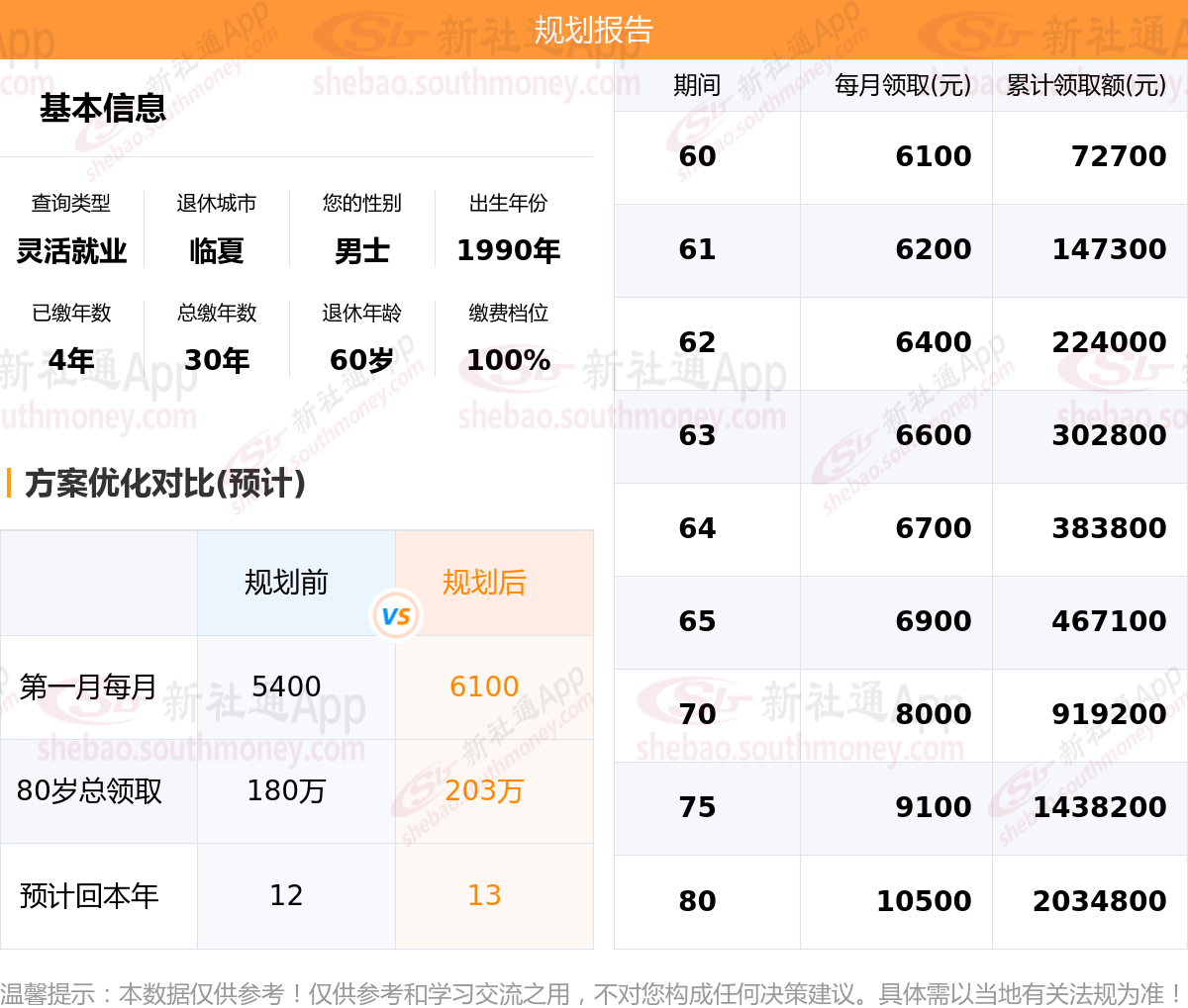 规划前:60岁第一个月约领5400元,新社通APP-养老金规划后:60岁第一个月约领6100元