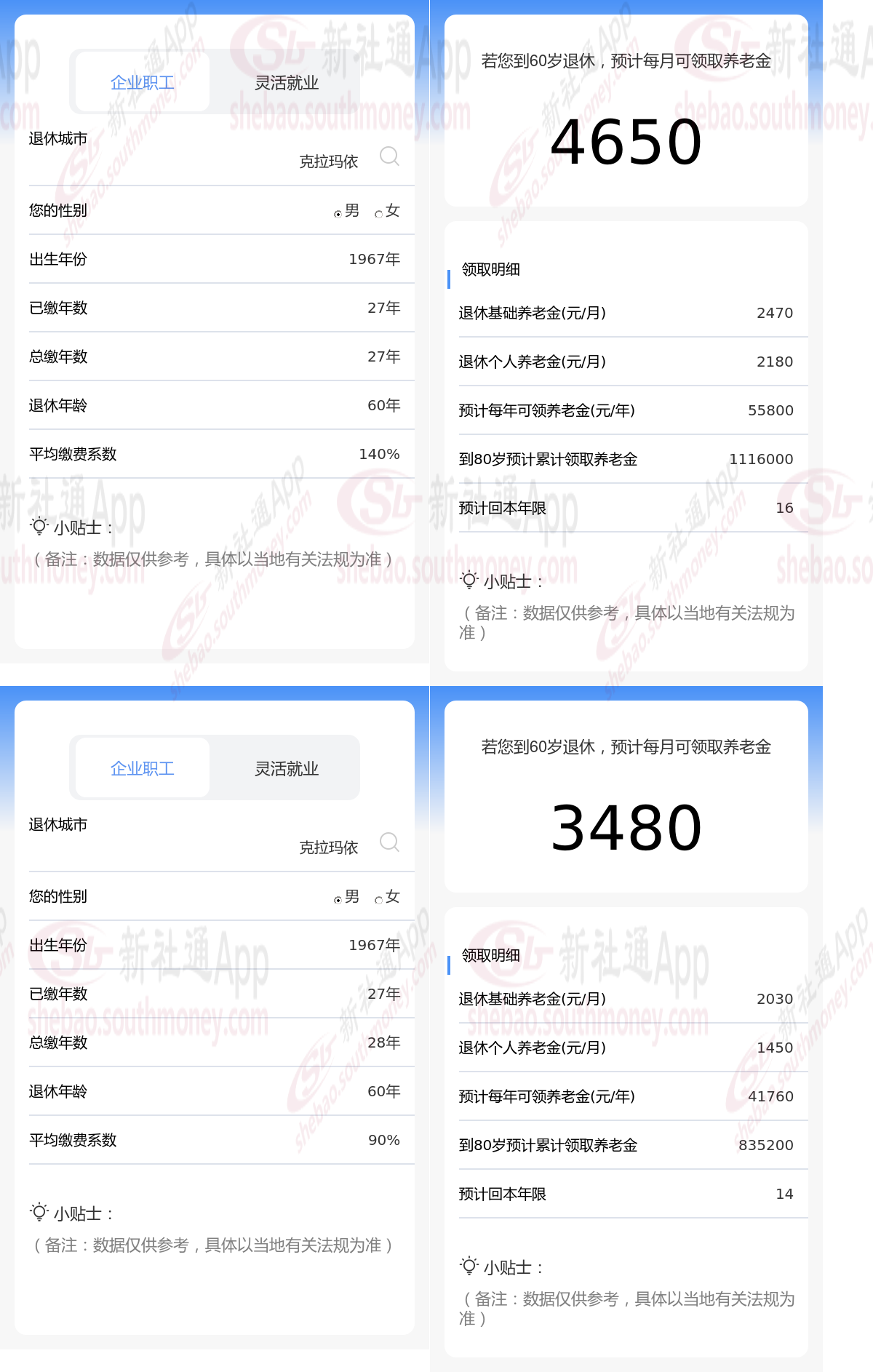 下面我们一起来看下,以新疆克拉玛依为例(不考虑过渡养老金):