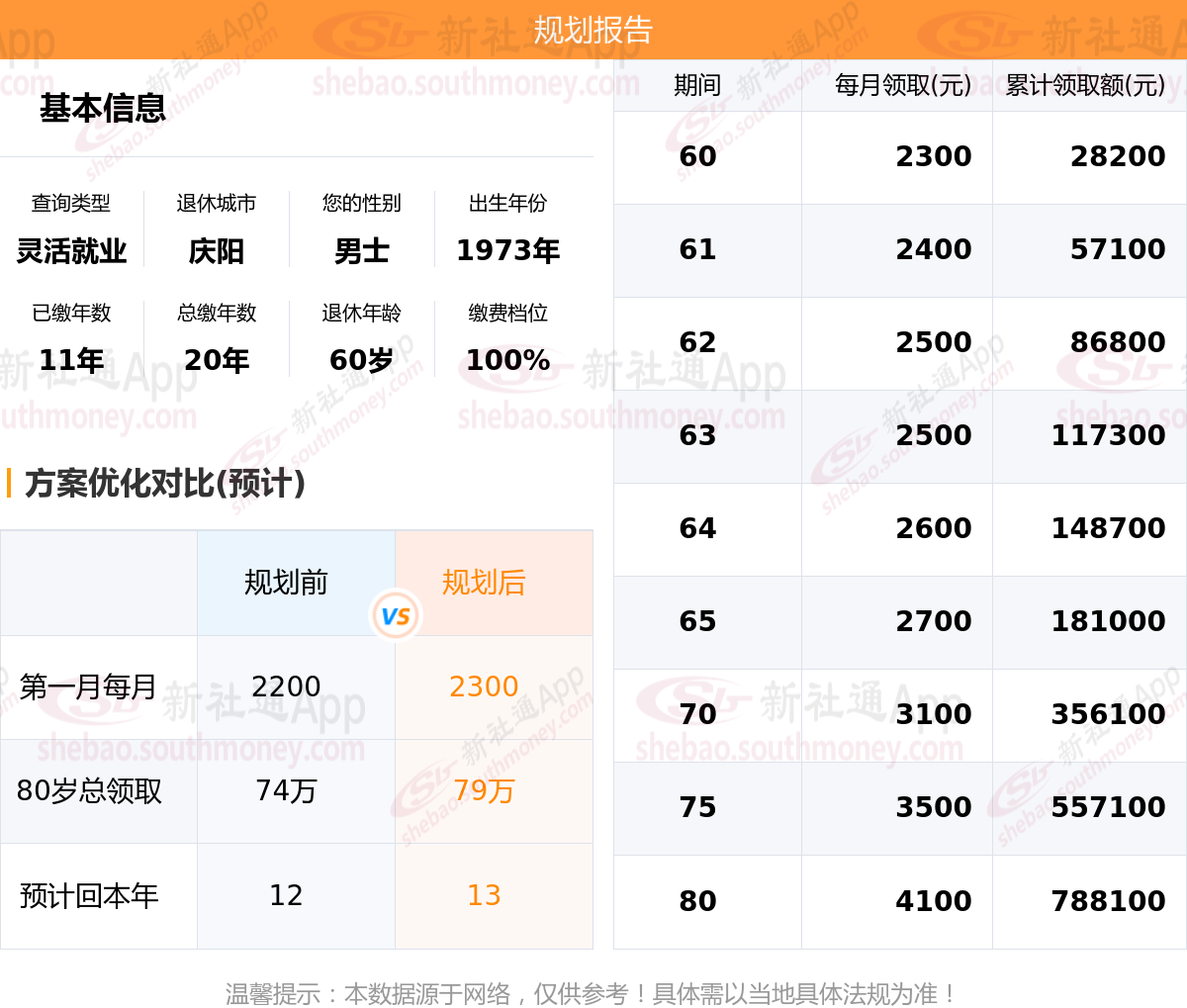 在规划退休生活时,延长缴费年限是为未来打下坚实基础;而提高缴费档位可能更多地反映了当前对生活质量或生活水平的即时需求。新社通根据养老计算公式给出相关优化规划。举例甘肃庆阳