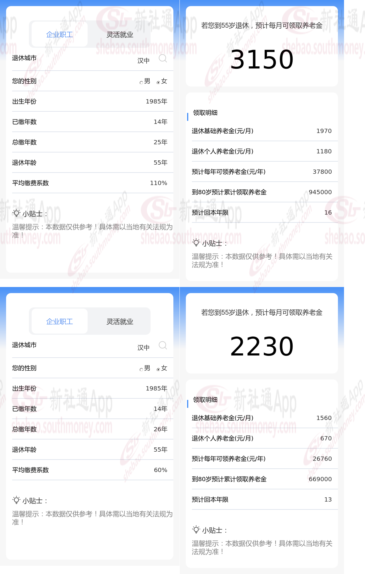 新社通app养老金计算器,轻松测算您的养老金!:两者相差3150-2230=920元。