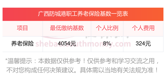 根据有关法规,广西防城港企业职工基本养老保险缴费基数暂按不低于4053.6元;