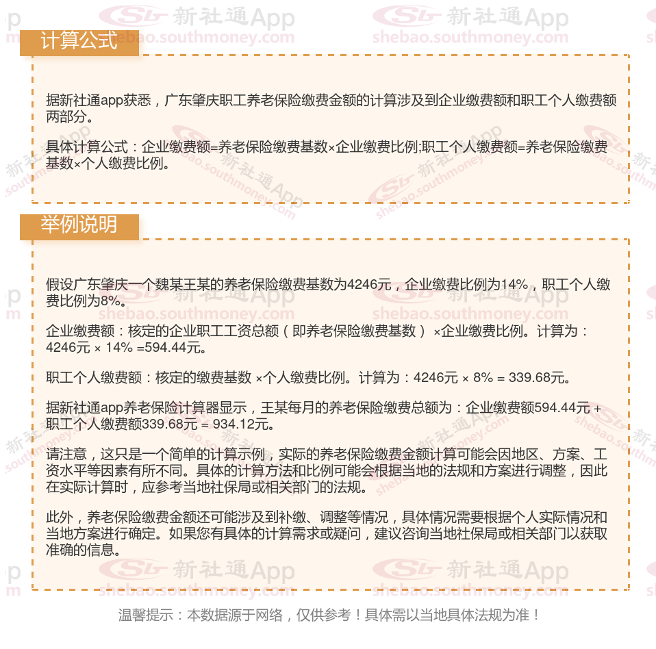 据新社通app获悉,广东肇庆养老保险的缴费金额计算通常涉及缴费基数和缴费比例两个因素。以下是一个基于虚构数据的计算举例说明: